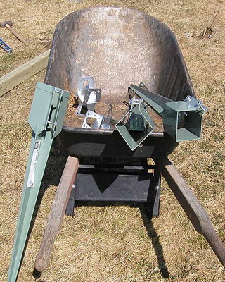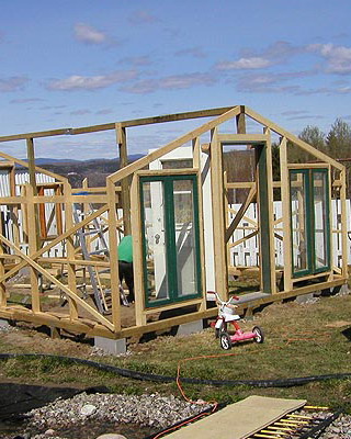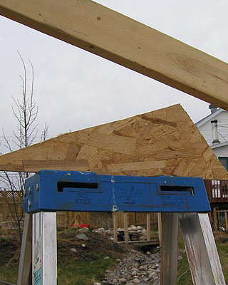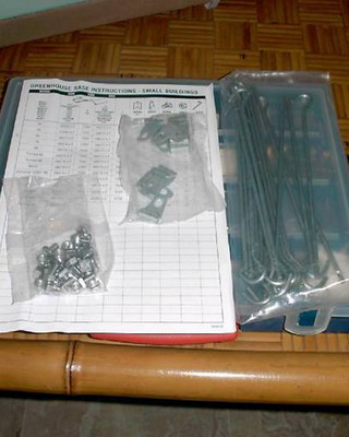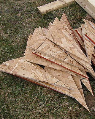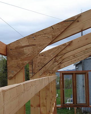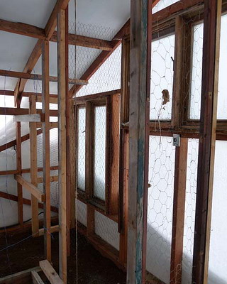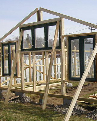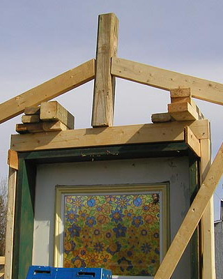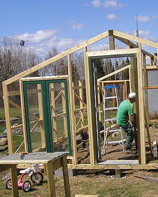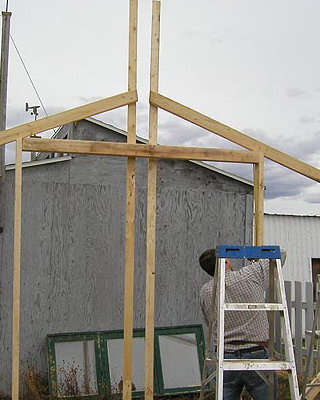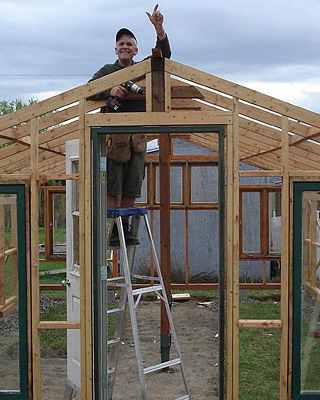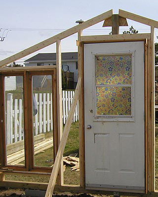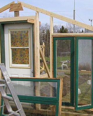 Раму собирают из брусков, внутрь устанавливают крестовину-распорку, которую укрепляют с помощью шурупов, ввинченных в торец. На боковинах с противоположных сторон просверливают по два отверстия на одинаковом расстоянии. Готовые рамы перетягивают пленкой. При этом одну раму используют для изготовления дверной коробки и еще одну для изготовления двери. Далее изготавливают восемь ферм для кровли с основанием 3 м, высотой 0,7 м и длиной скатов 1,75 м. Углы соединяют «шип в паз», а упоры крепят на шурупы. Две фермы, фронтальную и тыльную, обтягивают пленкой с одной стороны, вторую сторону перетягивают после соединения со скатом. Во всех фермах просверливают по два отверстия на скат в одинаковых точках. Далее собирают восемь рам со сторонами 1,05×1,75 м, просверливают отверстия в тех же точках и перетягивают с двух сторон полиэтиленовой пленкой. На этом же этапе подготавливают конек и козырьки из жести или оцинкованного металлического листа. Для этих же целей можно использовать полиэтиленовую трубу диаметром не менее 160 мм, разрезав ее пополам вдоль.
