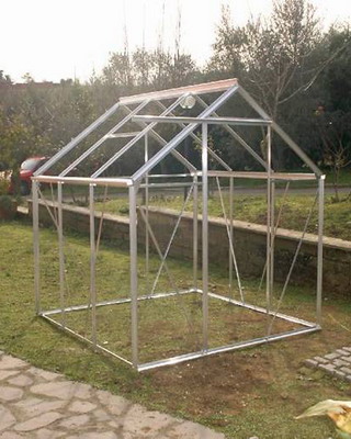 Каркасная теплица из металлического уголка сооружается следующим образом. По углам и периметру будущего строения на расстоянии не более 1,5м роют лунки размером 20×20 см и глубиной около 50 см. В лунки по углам вставляют концы строенных уголков, а в лунки по линиям стен — концы спаренных уголков толщиной 4 мм, со сторонами 50 и 2700 мм (приведенные размеры минимальны, уменьшать их не рекомендуется). Затем углубления бетонируют так, чтобы верхние концы уголков располагались на одинаковом уровне, нижние находились строго по внешнему периметру теплицы, а бетонные столбики были выше уровня земли на 15-20 см. Внутренняя сторона уголков должна смотреть наружу, как бы образуя нишу-подрамник, куда впоследствии будет вставлена деревянная рама для стекол. Тот же принцип нужно соблюдать при установке остальных деталей металлического каркаса.