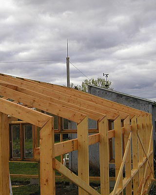 Далее верхние и нижние концы стоек соединяют обвязкой и по месту стоек устанавливают двускатные каркасы, поверх которых наваривают подрамники из уголков. Когда каркас готов, в каждом подрамнике по периметру сверлят отверстия диаметром 10-12 мм на расстоянии 50 см для крепления рам.