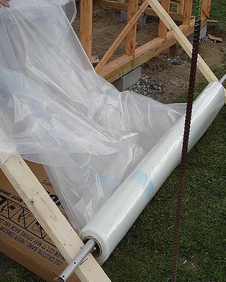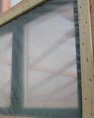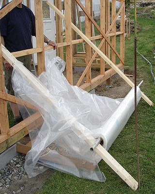 На заключительном этапе обтягивают внутренние стороны фронтальной и тыльной арок: пленку вырезают по контуру и проклеивают по периметру либо сплавляют утюгом при температуре около + 100 °С. По всему периметру теплицы подсыпают землю, поверх делают цементную стяжку или кладут шифер и копают канавки для отвода воды.