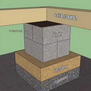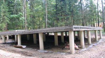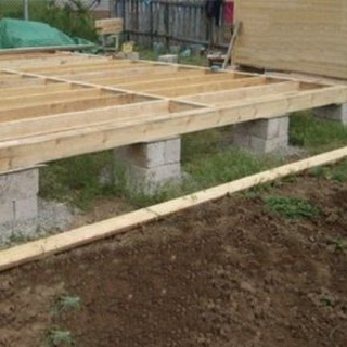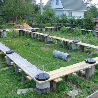 С чего начинается возведение любого серьезного объекта? Нужно сначала обустроить фундамент на столбах или других железобетонных конструкциях. Здесь будет использоваться фундамент дома на столбах с невысокой несущей способностью поскольку каркасное сооружение дачного назначения обладает очень небольшой физической массой. Обычно фундамент на бетонных столбах применяется лишь в малоэтажном строительстве объектов, которые предназначены для сезонного использования. Для жилого здания он не подойдет, поскольку зимой будет создавать условия для промерзания подвальных помещений. Посмотрите в статье советы профессионалов. Они детально рассказывают про технологию закладки для последующего процесса строительства. Материал богато проиллюстрирован фото и видео. Фундамент состоит из 10 бетонных столбов под жилой частью и 5 стальных труб, на которые опирается терраса.