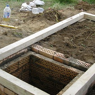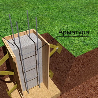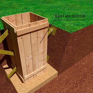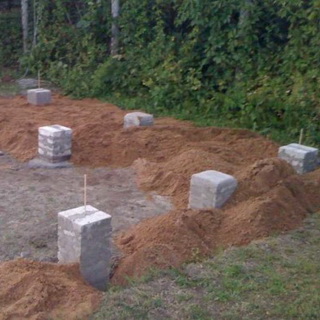 Для обустройства фундамента хозблока с туалетом своими руками нужно выкопать четыре ямы размером 500 х 500 мм и глубиной 400 мм и засыпать их смесью песка и щебня. На подготовленную подушку устанавливают деревянную или фанерную опалубку высотой 100 мм, укрепляют кусками проволоки и арматуры и заливают бетонным раствором.