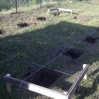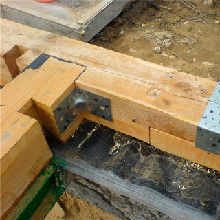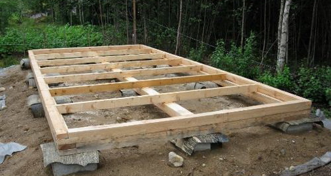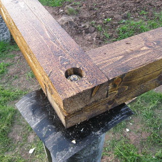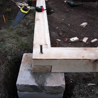 На фундамент укладывают два бревна длиной 1800 мм, окантованные с двух сторон и обработанные горячим отработанным машинным маслом. Между фундаментными плитами и бревнами прокладывают по два слоя рубероида. Чтобы обеспечить постройке устойчивость при сильном ветре, в бревнах просверливают по два отверстия и длинными штырями прибивают бревна к земле.