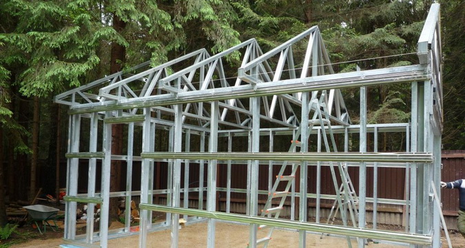 Теперь ознакомьтесь с процессом возведения универсального металлического каркаса размером 6×4 м (по наружному обмеру) для дачной хозяйственной постройки. Предлагаемый каркас при сплошной облицовке наружных стен можно использовать как сарай или гараж, а при наличии внутренней облицовки и окон — как летний домик. Если же вовсе не обшивать стены (или обшить только заднюю стену), то в нем можно устроить отличную летнюю кухню, поскольку этот каркас не боится огня и достаточно прочен, чтобы разместить в нем хоть буржуйку, хоть печь-барбекю или даже кирпичную варочную печь.