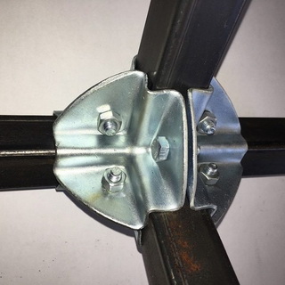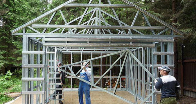 Все секции, кроме стропильных, собирают на болтах. Вертикальные наружные стены и ворота при возведении хозяйственных построек покрывают оцинкованным листом на саморезах по металлу или заклепках с помощью заклепочника. Покрытие крыши производят тем же листом, но для этого к угольникам, приваренным к верхнему брусу стропильной фермы, сначала должна быть привернута доска, к которой потом прибивают обрешетку.