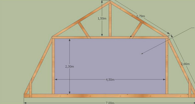 Для увеличения объема сарая на выделенной площади устраивают крыши с ломаным профилем. Такая конструкция сарая сложнее. Излом ската крыши усиливают подкосом, опирающимся на бетонный фундамент, конек — подкосом, опирающимся на верхний прогон стены. В результате образуются жесткие треугольные конструкции. Строительство таких сараев требует качественной работы. Все узлы несущих конструкций выполняют в соответствии с чертежами.
