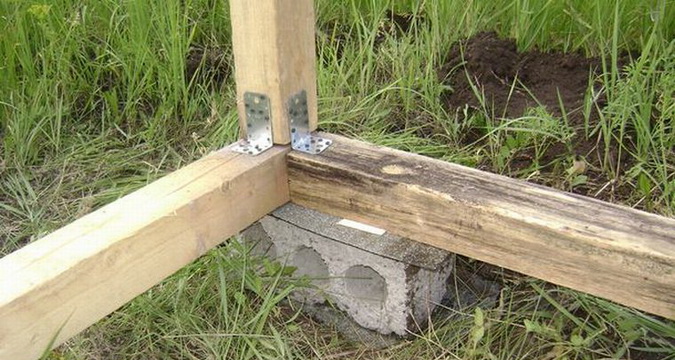 Каркас хозблока для дачи, возводимого своими руками, состоит из основания, которое делают из бруса сечением 75×75 мм, и двух боковых рам, собираемых из брусков сечением 40 х 60 мм. Брусья основания укладывают на фундамент и соединяют между собой на уголках и шурупах. Для проверки прямоугольности основания измеряют диагонали, длина которых должна быть одинаковой. Горизонтальность основания проверяют по уровню и при необходимости выравнивают его, подсыпая или убирая щебень.