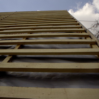 После подъема двух-трех арок их временно закрепляют и устанавливают прогоны для стропил и другие элементы, придающие устойчивость смонтированной части сарая. Установив стропила, прибивают обрешетку. Кровлю сарая выполняют из волнистых асбестоцементных листов. В торцевой стене сарая под коньком крыши оставляют окна. Сарай обшивают досками толщиной 25 мм.