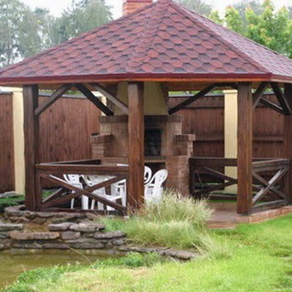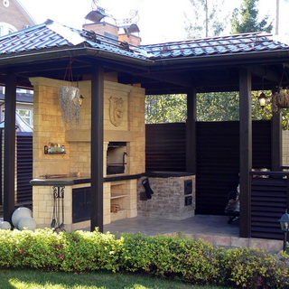 Для мангала или барбекю можно устроить площадку в зоне отдыха, сделать навес или хотя бы натянуть над ней тент. Возле печи сооружают деревянный помост, на котором расставляют легкую мебель. Над помостом сооружают легкий навес-перголу, стойки которой могут быть изготовлены из труб и соединены в единую жесткую конструкцию с помощью деревянных перекладин. В земле стойки бетонируют или крепят к фундаментным блокам. По перекладинам крепят сетки или решетки-шпалеры, служащие опорой для вьющихся растений. Все это образует зеленый шатер, защищающий от солнца. Подобную зеленую кулису устраивают также на одной или двух боковых стенках навеса. Для защиты от дождя на крышу можно набросить брезент или клеенку, а при желании или необходимости устроить постоянную кровлю.