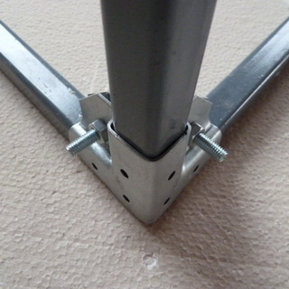 Боковые рамы каркаса удобно собирать на жестком основании — листе фанеры, ДСП или каком-либо подобном материале. Бруски скрепляют, как и детали основания, на уголках и шурупах, но уголки в этом случае используют меньшего размера. Соединения здесь также следует выполнять строго под прямым углом. Каждую боковую раму усиливают четырьмя короткими дополнительными стойками.