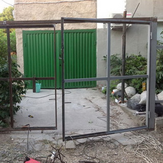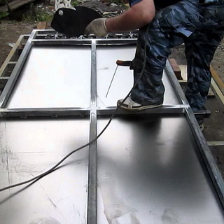 Обшивать рамы профлистом или листами поликарбоната можно как до монтажа, так и после, когда они уже будут стоять в проеме. Крепят эти материалы саморезами по металлу. Желательно так подобрать направление обшивки, чтобы листы не имели швов в пределах одной створки. Предварительно раму следует покрыть грунтом и краской. Если предполагается обшить створки листовой сталью или кровельным железом, то целесообразно вначале обшить раму листами с помощью сварки, а уже затем монтировать на ней навесы и задвижки. Разумеется, грунт и краску наносят после сварочных работ.