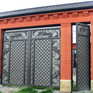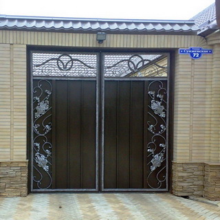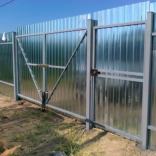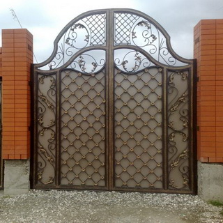 Распашные металлические ворота для дачи создают, как правило, по одной схеме — из двух половин (створок) высотой 1,6—1,8 м при общей ширине пролета 2,4—3,5 м. Каждая створка представляет собой раму из металлической трубы 60 х 40 х 1,5—2 или 40 х 40 х 1,5—2 мм, обшитую каким-либо материалом. Для обшивки чаще всего используют профлист, поликарбонат, гладкий прокатный или оцинкованный лист. Вместо глухой обшивки створка может быть заполнена металлической сеткой или решеткой из профилированного или кованого металла.