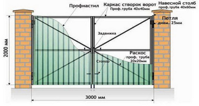 Перед тем как сделать такие ворота из металла, первым делом необходимо снять точные размеры проема: ширину и высоту. Не стоит забывать, что технический просвет (расстояние между уровнем дороги и нижней кромкой ворот или калитки) должен составлять не менее 50 мм. При зазоре 100—150 мм ворота можно будет без труда открыть даже при достаточно большом снежном покрове.