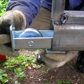 После того как закуплены материалы и комплектующие, нужно выточить детали роликов и собрать роликовые узлы. Затем готовят ямы для опорных столбов, устанавливают их и бетонируют. В столбах сверлят отверстия для осей роликов на высоте 150 мм от земли.
