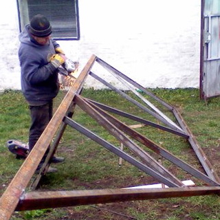 Когда все отрезки профиля будут правильно стыковаться, зафиксируйте их струбцинами и приступайте к сварке внешней рамы. Затем измерьте и сравните диагонали рамы, чтобы убедиться в ее прямоугольности, после чего можно приваривать укосины или поперечины. Их рисунок может быть разным, главное — обеспечить створкам жесткость. Чтобы сделать металлические ворота своими руками как можно более прочными, дополнительно по углам рамы можно наварить треугольные косынки из листовой стали толщиной 3 мм. Затем еще раз пройдитесь болгаркой со шлифовальным диском, очистите места сварки и удалите шлак.