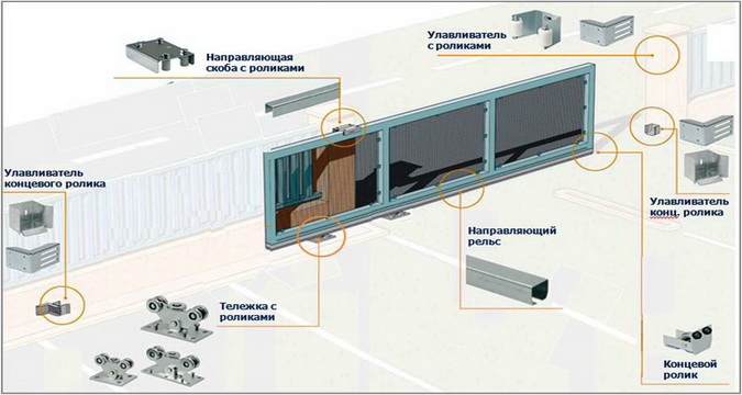 Установка сдвижных металлических ворот своими руками рекомендована в тех случаях, когда требуется перекрыть широкий проезд, причем без установки верхней несущей балки. Их конструкция имеет четыре основных узла: