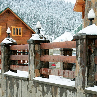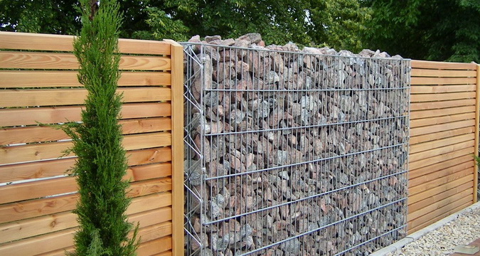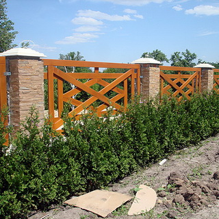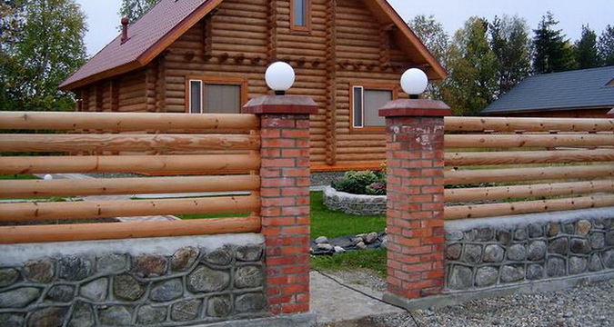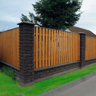 Комбинированные заборы, состоящие из камня и дерева, характеризуются слабой защитной функцией, но выглядят красиво. Высота столбов порядка 2 м требует создания бетонного фундамента глубиной около 1 м и шириной 0,5 м. Сверху столбы закрывают защитной бетонной шапкой.