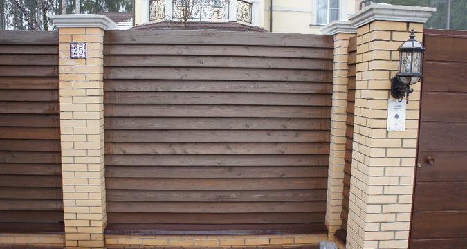 К достоинствам можно отнести высокую устойчивость к атмосферным явлениям, долговечность и то, что такой забор полностью защищает усадьбу от посторонних взглядов и нежелательного проникновения.