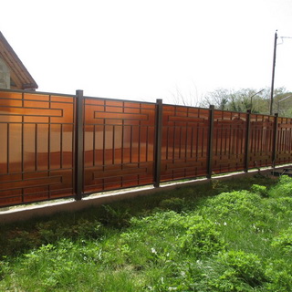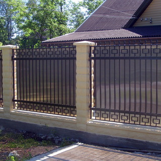 Комбинированный забор из поликарбоната всегда выглядит привлекательно и выделяется на фоне других конструкций данного типа. Лучше всего смотрятся конструкции, основа которых состоит из кованых элементов и поликарбонатных панелей, прикрепленных к ним с внешней стороны.