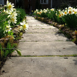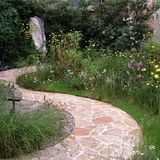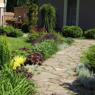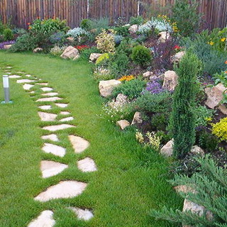 Дорожки, проложенные вдоль забора, обычно оформляют пышным миксбордером с одной стороны и газоном — с другой. Как правило, многие садоводы стараются проложить дорожку точно по контуру лужайки, но гораздо интереснее сделать так, чтобы она не совпадала с границей между газоном и миксбордером. Намного естественнее будет смотреться дорожка, которая то входит в цветочную композицию, то снова выходит на газон. Особенно эффективным такое решение считается для небольших участков.