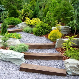 Благодаря оформлению садовых дорожек растениями и «встроенному» дугообразному мостику участок не будет выглядеть плоским, а путь станет интереснее. Мостик можно перекинуть через сухой ручей или небольшой водоем, напоминающий естественное озеро с неровными краями. Для оформления дорожек на участке недалеко от остистой сосны обустроим клумбу с растениями, предпочитающими кислую почву: рододендрон, карликовый вид горной сосны. По берегам водоема, между камнями, посадим низкий зимозеленый кизильник Даммера, вербу или плакучую иву, темносиние ирисы, ситник развесистый, бузульник и лилейник.