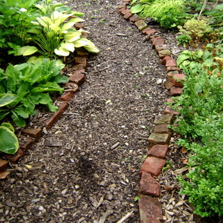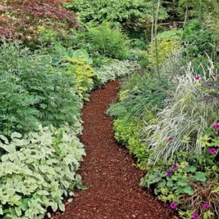 Вырубка старых деревьев и кустарников, обрезка поросли и удаление одревесневших побегов дают постоянный приток материала для дорожек. Садовые измельчители растительных отходов дарят им вторую жизнь. Порубленная древесная мелочевка обычно используется в качестве мульчирующего материала, но она отлично подходит и для подсыпки дорожек. Чтобы обрезки веток не «разбегались» по газону, где они могут попасть под ножи газонокосилки, для дорожки снимают 15 см грунта.