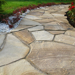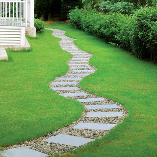 Под мощение дорожек натуральным камнем выкапывают траншею глубиной 25 см, добавив припуск на опалубку. На песчаных почвах с хорошим стоком воды бетон можно укладывать прямо на утрамбованный грунт. На плотных и глинистых почвах сначала устраивают песчано-гравийную подушку: слой песка 10 см, затем гравий. Затем заливают бетон. Для дорожки шириной 1 м слой бетона должен быть порядка 1 5 см. Дорожное полотно по всей длине разбивают на участки разделительными поперечными досками. Бетонную смесь с натуральным камнем выкладывают между разделительными досками, через одну. Когда бетон затвердеет, доски удаляют и заполняют пустые ячейки.
