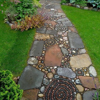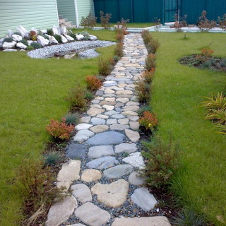 Дорожка из речной гальки или булыжника имеет очень красивую фактуру и, при правильном устройстве, удобна. Этот материал позволяет выкладывать мозаику, ведь галька имеет множество цветов и оттенков. По технологии мощения природным камнем можно использовать также морскую гальку, однако в ней слишком много соли, которая мешает загустению цементной смеси.