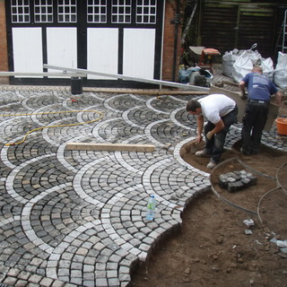 Вершина мастерства — это мощение дорожек брусчаткой в форме дуг, сегментов и кругов. Чтобы это удалось, расположение дуг размечают с помощью самодельного циркуля с гвоздями. Укладку всегда начинают на самой дуге, двигаясь к центру круга. Для этого используют камни двух размеров, что не так уж и просто.