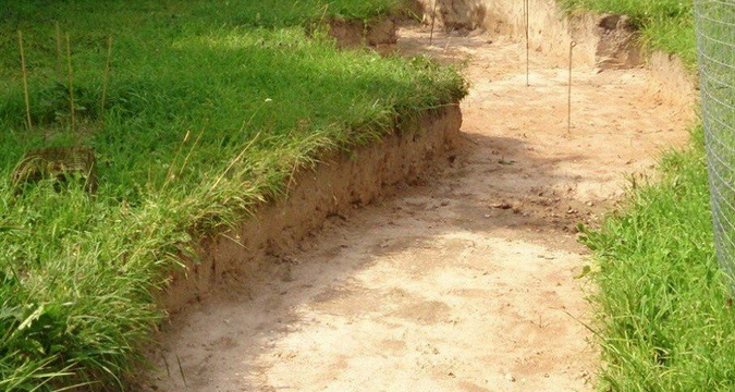 Траншею засыпьте крупнозернистым речным песком слоем 5-15 см (в зависимости от почвы) и утрамбуйте ручной трамбовкой или специальной машиной, периодически проверяя горизонтальность с помощью уровня. Дополнительно под песок можно уложить слой мелкого гравия в качестве дренажа.
