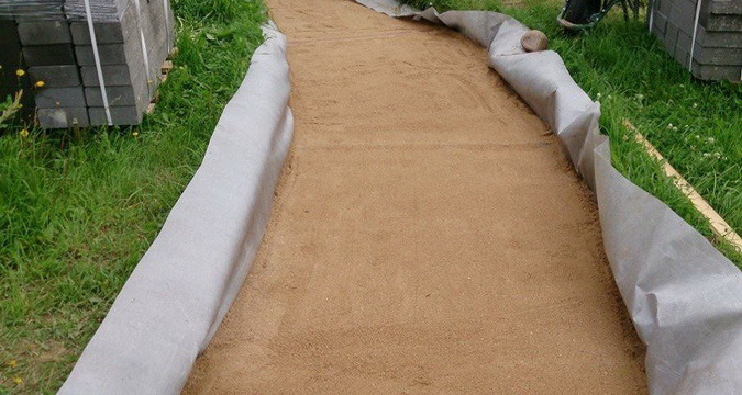 - Укладка «подушки». Проложите вдоль контуров дорожки пластиковый бордюр. Устройте основание: нижний слой из гравия, верхний — из песка. Утрамбуйте.