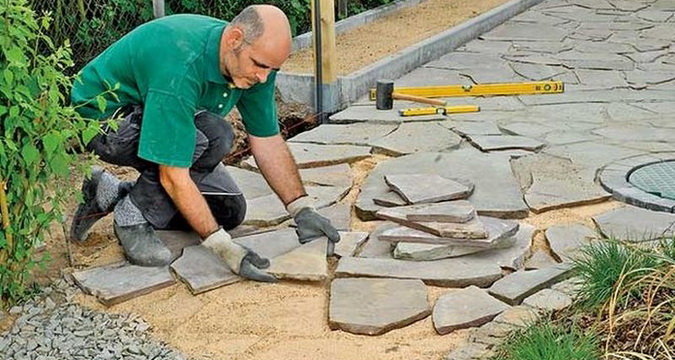 Пошаговое мощение натуральным камнем включает в себя следующие действия: