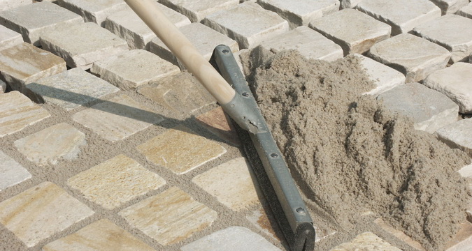 - Укладка брусчатки. Укладывайте камни с зазором в 1-2 мм. Засыпьте их сухим песком, пролейте водой и через неделю повторите засыпку еще раз.
