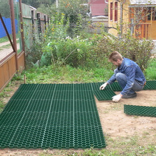 Газонная решетка. Этот тип покрытия сочетает красоту зеленого газона и прочность. Модули могут быть из пластика или бетона, устойчивые к значительным перепадам температур. На маркировке решеток указывается допустимая нагрузка, но легковой автомобиль выдерживают практически все.