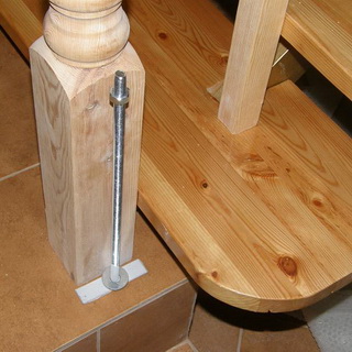 После вкручивания шпилек гайки необходимо снять. То же самое нужно сделать со столбами, только в этом случае вкручиваемая шпилька должна быть толщиной 10 мм. В нижней ступени следует выполнить отверстие диаметром 7 мм и вкрутить столб в ступень. После этого столб нужно выкрутить, оставив шпильку в ступени.
