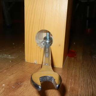 Затем с помощью тонкого сверла следует сделать небольшое углубление. Используя специальное приспособление для сверления перпендикулярных отверстий (со сверлом 5 мм), нужно выполнить отверстия в ступенях под установку балясин. После этого можно вкрутить шпильки в балясины и закрутить в ступени. С помощью угольника нужно проверить оси балясин.