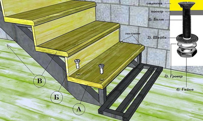 В торце ступени нужно просверлить два углубления. В них впоследствии следует вставить распорные анкеры через отверстия в стойках и втулки с декоративными накладками так, чтобы конец каждого анкера слегка выступал.