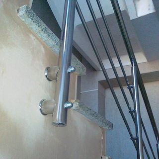 Нержавеющие поручни перед установкой необходимо отрезать нужной длины под прямым углом. Затем следует обозначить места, где будут просверлены отверстия, приложив поручень к стойкам. После установки шарниров поручни можно закреплять.