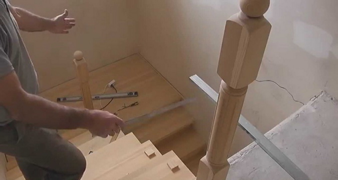 Ступень должна крепиться к полу с помощью анкерного болта, скрыв его столбом. Для установки верхнего столба необходимо разметить место. В центр следует вкрутить саморез, после чего натянуть леску между ним и шпилькой нижней ступени. На каждой ступеньке с помощью угольника необходимо провести линии осей балясин, разметить их центры.