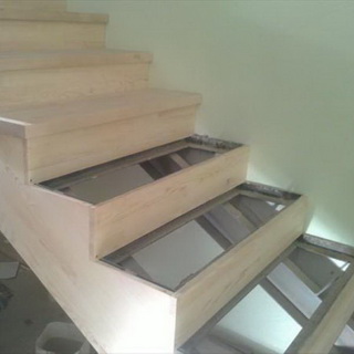 После выбора древесины для отделки металлических лестниц необходимо определиться с демпфирующим материалом. В качестве такого звукопоглощающего материала можно использовать куски резины или старого линолеума. Для этого следует острым строительным ножом вырезать куски линолеума (или резины) подходящего размера и приклеить их жидкими гвоздями в местах соприкосновения дерева с металлом.