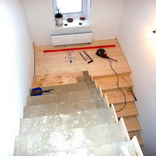 Как показано на фото, при отделке бетонной лестницы деревом, если бетонные ступени неровные, то рекомендуется поверх них соорудить деревянный каркас из брусков (лаг). Линейкой необходимо отмерить бруски подходящей длины и отрезать их болгаркой. Затем нужно соединить деревянные бруски между собой с помощью шуруповерта. Делать это нужно строго под прямым углом, проверяя вертикальность уровнем. На построенный деревянный каркас с помощью клея и шурупов следует закрепить доски: проступи и подступенки. При отделке бетонной лестницы деревом сверху ступени необходимо покрыть специальным лаком для дерева.