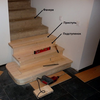 На каждую ступеньку, начиная снизу лестничной конструкции, следует закреплять фанеру, по размеру равную площади ступеньки. Фанеру необходимо резать, используя электролобзик.