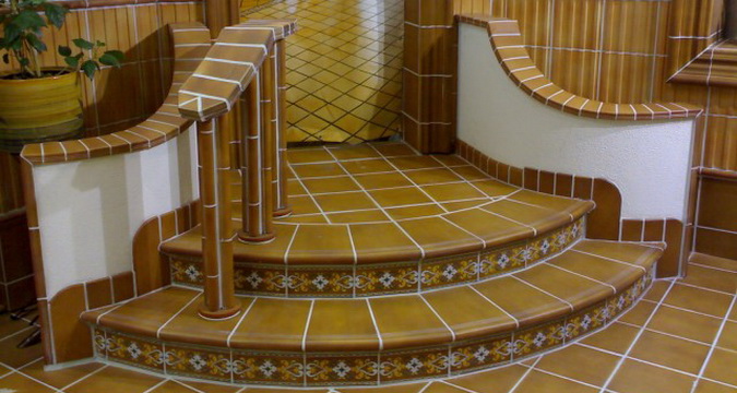 Укладку плитки следует производить, слегка вдавливая ее и выравнивая поверхность. Затем осторожно, чтобы не сместить плитку, необходимо удалить остатки раствора, накрыть лестницу влажной тканью и оставить для застывания. После этого при отделке бетонной лестницы своими руками нужно затереть швы жидким раствором, а когда он затвердеет — протереть ступени.