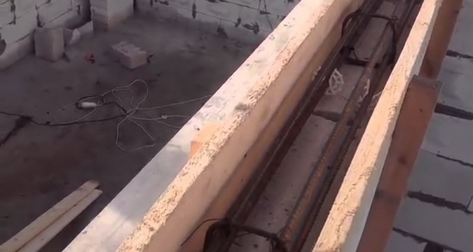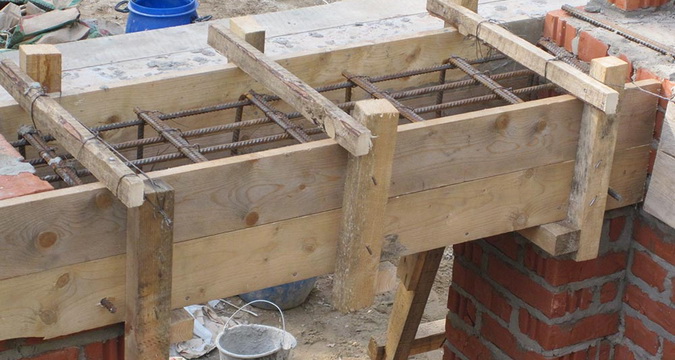 Во-вторых, на опалубку нужно нанести слой бетонного раствора толщиной 20-30 мм, армировав его металлическими стержнями диаметром 4-6 мм. Арматуру необходимо завести за край проемов примерно на 25 см и загнуть вокруг кирпича — таким образом армированная перемычка будет зафиксирована в кладке своего рода анкером.