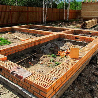 Поэтапное строительство фундамента для бани из кирпича основано на тех же принципах, что и для сооружений из других материалов: сначала роется опоясывающая траншея, рассчитанная на размер бани, затем сооружается опалубка, немного приподнятая над землей, и заливается бетонный раствор с каменным наполнителем мелкой фракции (например, щебнем). В качестве обрамляющего пояса фундамента рекомендуется использовать дубовые доски, которые почти не поддаются гниению, а значит, строение будет достаточно долговечным. Затем устраивается гидроизоляция фундамента, размечаются стены с дверными проемами.