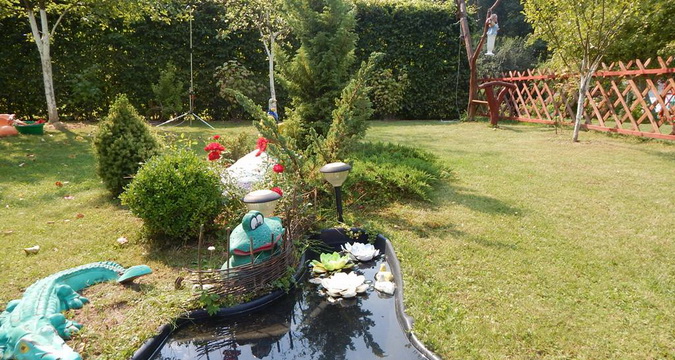 Можно включить в проект небольшие садовые скамейки, дающие тень навесы из камыша, садовая скульптура и декоративные фигурки гномов, зайчиков или даже крокодилов, водоемы (пруды, фонтаны и водопады), особая система ландшафтного освещения, детские площадки, террасы, беседки и многое другое.