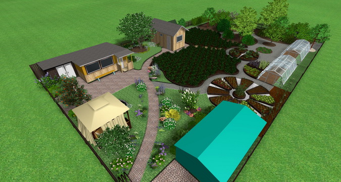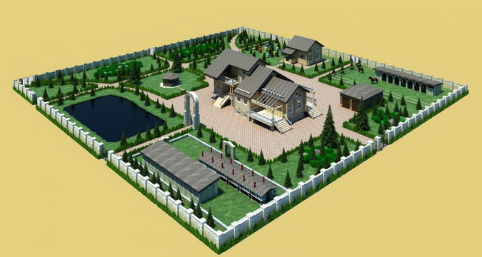 Далее, в зависимости от наличествующих факторов, необходимо четко спланировать расположение различных зон и объектов. Как показывает практика, нужно спроектировать на участке хозяйственные постройки (помещения для топлива, хозяйственного инвентаря, содержания домашних животных, погреба, гаража и т. д.), зоны отдыха (беседки, террасы, бассейна или бани, детской площадка и пр.), а также огород, плодовый сад, вход и выход с территории.