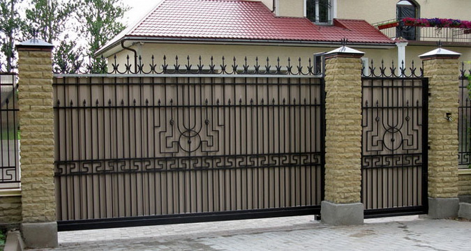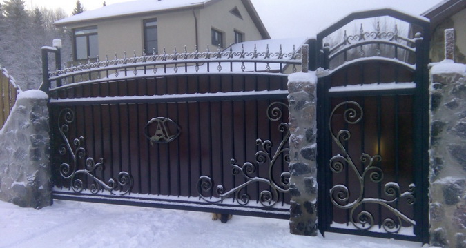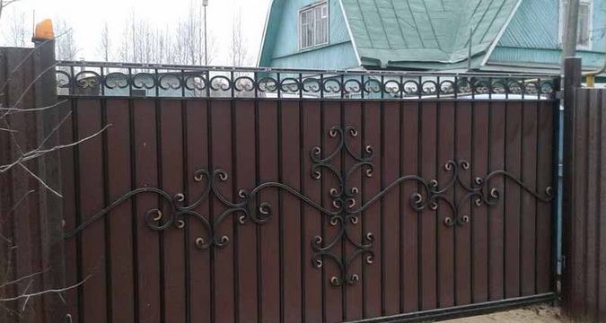 Очень красиво выглядят ворота из профлиста с элементами ковки. Эта дополнительная деталь придает сооружению очень необычный и даже изысканный вид. Такие ворота могут стать достойным украшением загородного участка.