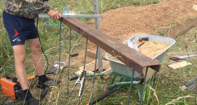 После этого нужно выкопать яму в половину ширины проема ворот, в которую помещается швеллер вниз полками. Далее вся конструкция заливается бетонным раствором.