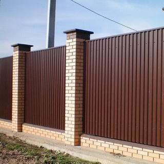Листы профнастила можно крепить на лаги из профильной трубы. Такой вариант строительства будет самым легким и дешевым. Если опорные столбы будут из кирпича, бетона или другого материала, то на возведение забора придется потратить больше и времени, и средств.